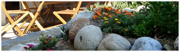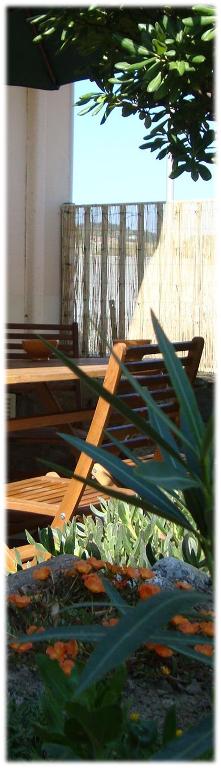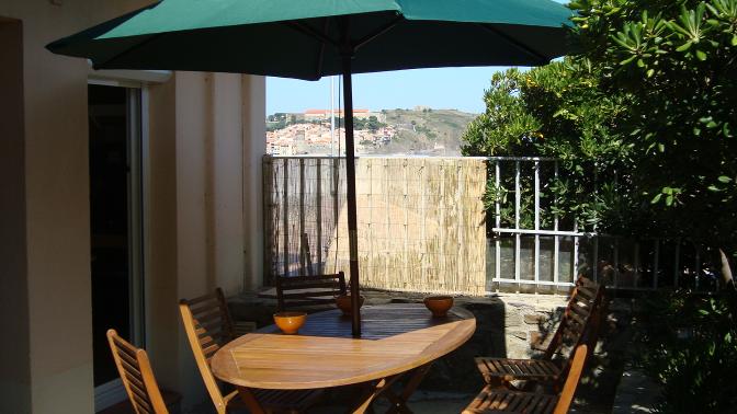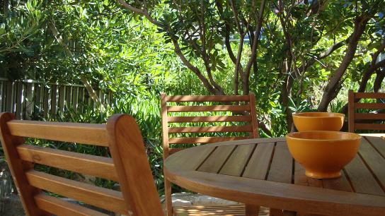 La terrasse, entourée de la végétation d’un petit jardin, offre un endroit abrité, où vous pourrez prendre vos repas aux beaux jours.